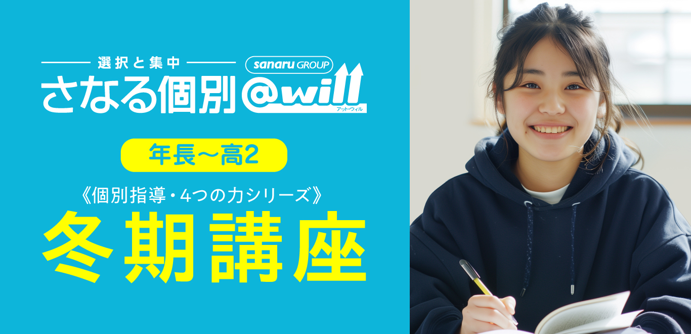 さなる個別@will 冬期講座 ホーム > 講座 > さなる個別@will 冬期講座 個別指導 冬期講座 佐鳴予備校「さなる個別@will」のサイトへ移動します。キャンペーンについても上記よりご確認ください。お申し込みは、佐鳴予備校・三島進学ゼミナールの各ホームページから可能です。