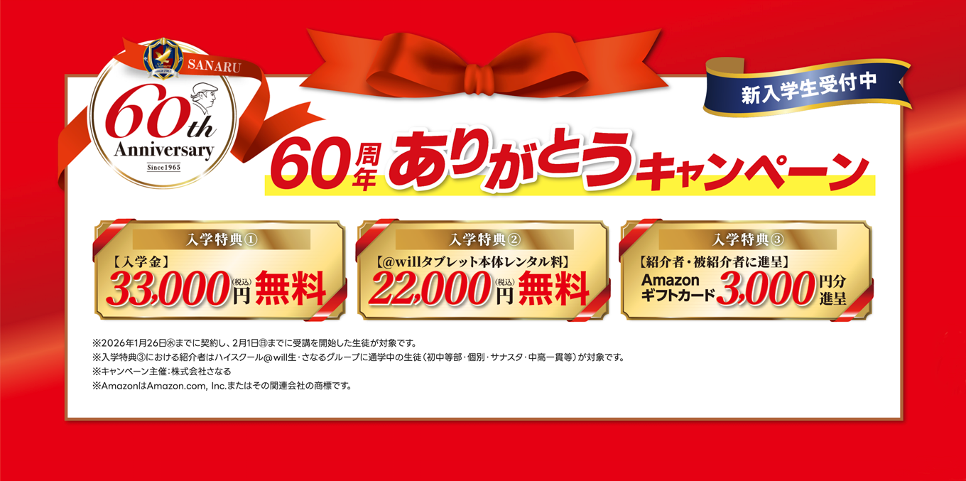- 「タブレット無償貸与」については、以前にさなるグループの入学特典を受けた方は対象外です。