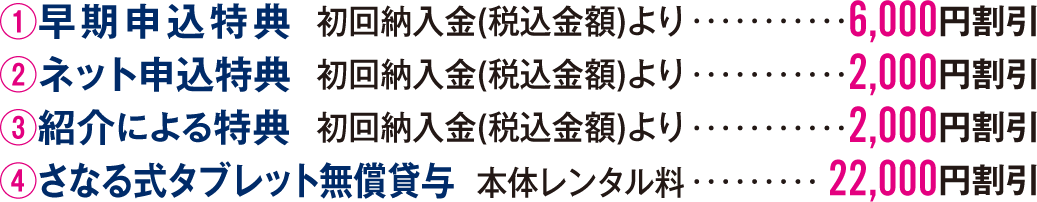 - 「早期申込特典」と「ネット申込特典」は、さなるグループ本科のキャンペーンを受けたことがない方が対象です。
