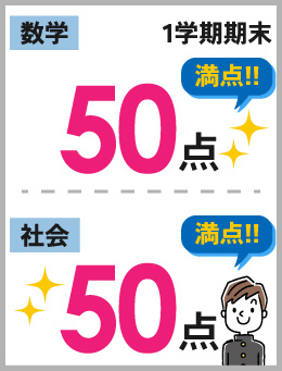 今回、2教科で満点を取ることが出来ました。毎回の個別授業では、テスト1か月前から本番を意識してたくさん問題を解くことができました。分からないところをすぐに解決でき、自分のペースで学習することができました!社会はAI学トレでテスト対策を行いました。学校ワークよりも難しい問題を何度も解くことができたので本番は自信を持って臨むことできました!