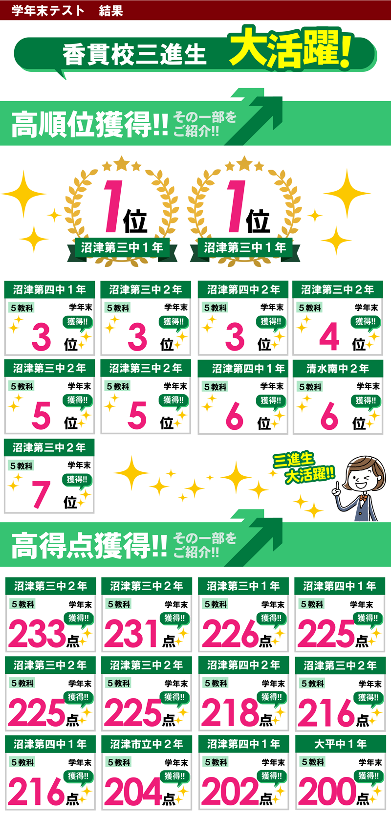 2007年に開校以来、たくさんの生徒が高校受験や定期テストで活躍を果たしてきました。勉強には、できなかったことができるようになる喜びがあり、また自分と深く向き合う瞬間でもあると思います。目先の点数に視野が狭くならず、高校や社会に出てからなど未来の舞台で活躍できる力を培います。目標を持ち、主体的に学習を進めることができる、そんな子供たちの想いと姿勢を育んでおります。